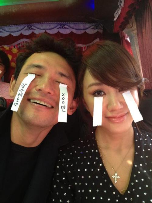 사진 속 엄정화와 황정민은 하얀 종이에 '200만 감사해요'라는 글을 쓰고는 이를 얼굴에 붙여 마치 눈물을 흘리는 것처럼 사진을 찍었다. 특히 감격스러워하는 황정민의 표정이 인상적이다.