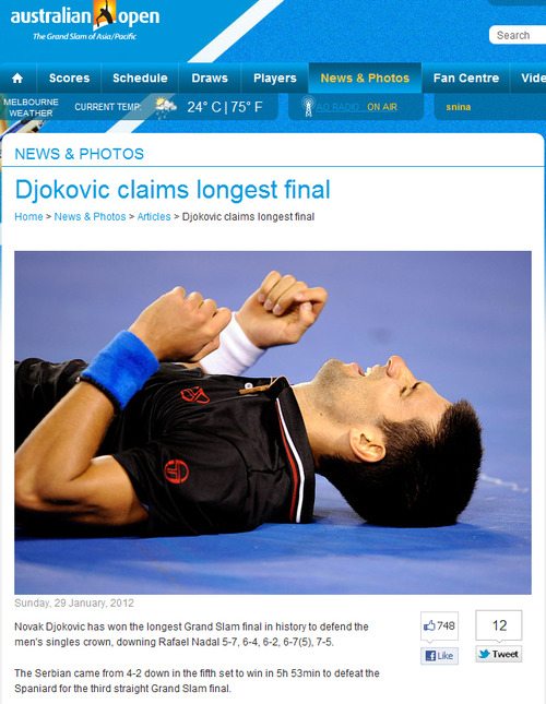 조코비치는 지난 29일(이하 한국시간) 호주 멜버른 로드레이버 아레나서 열린 '2012 호주 오픈' 남자단식 결승전에서 세계랭킹 2위의 라파엘 나달(26, 스페인)에 세트 스코어 3-2로(5-7 6-4 6-2 6-7(5-7) 7-5)로 승리를 거뒀다.