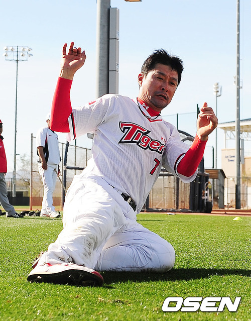 30일(한국시간) 미국 애리조나주 서프라이즈 '캔자스시티 로열스 컴플렉스'에서 진행된 KIA 스프링캠프에서 이종범이 슬라이딩 훈련을 하고 있다.
