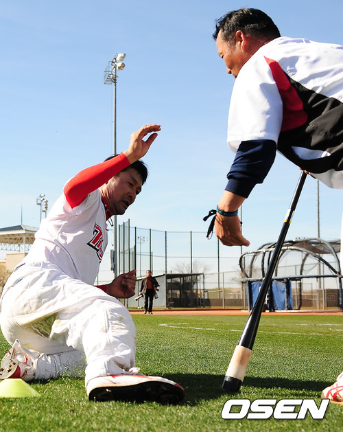 30일(한국시간) 미국 애리조나주 서프라이즈 '캔자스시티 로열스 컴플렉스'에서 진행된 KIA 스프링캠프에서 이종범이 슬라이딩 훈련을 하고 있다.