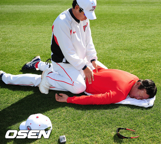 30일(한국시간) 미국 애리조나주 서프라이즈 '캔자스시티 로열스 컴플렉스'에서 진행된 KIA 스프링캠프에서 선동렬 감독이 안마를 받고 있다.