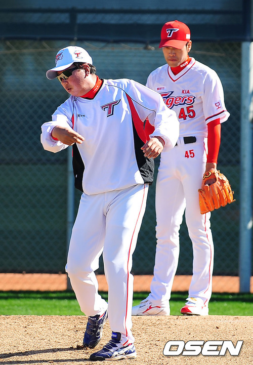30일(한국시간) 미국 애리조나주 서프라이즈 '캔자스시티 로열스 컴플렉스'에서 진행된 KIA 스프링캠프에서 불펜에서 선동렬 감독이 박준수에게 피칭 포즈를 보여주고 있다.