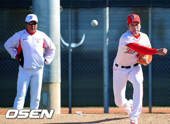 30일(한국시간) 미국 애리조나주 서프라이즈 '캔자스시티 로열스 컴플렉스'에서 진행된 KIA 스프링캠프에서 불펜에서 김준수가 선동렬 감독 앞에서 피칭을 하고 있다.