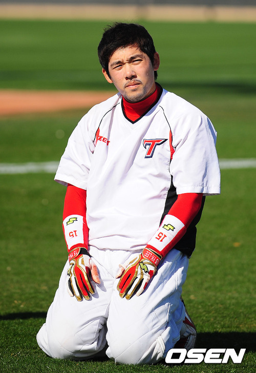 30일(한국시간) 미국 애리조나주 서프라이즈 '캔자스시티 로열스 컴플렉스'에서 진행된 KIA 스프링캠프에서 이용규가 훈련중 무릎을 꿇고 인상을 쓰고 있다.