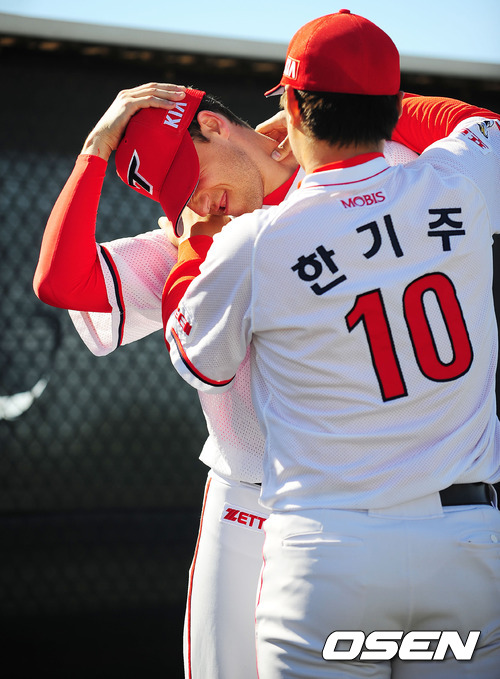 30일(한국시간) 미국 애리조나주 서프라이즈 '캔자스시티 로열스 컴플렉스'에서 진행된 KIA 스프링캠프에서 한기주가 알렉스의 목을 풀어주고 있다.