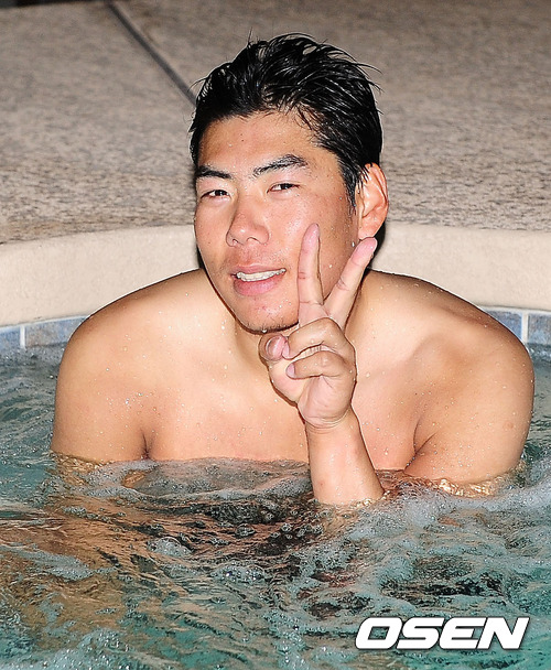 30일(한국시간) 미국 애리조나주 서프라이즈 '텍사스 레인저스 볼파크' 근처 넥센 히어로즈 숙소의 풀장에서 야간에 넥센 강정호가 즐겁게 물놀이를 하고 있다.
