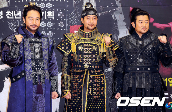 30일 오후 경남 합천 대장경 천년관에서 공개된 드라마 '무신' 제작발표회에서 배우 김주혁과 정보석, 박상민이 포즈를 취하고 있다.