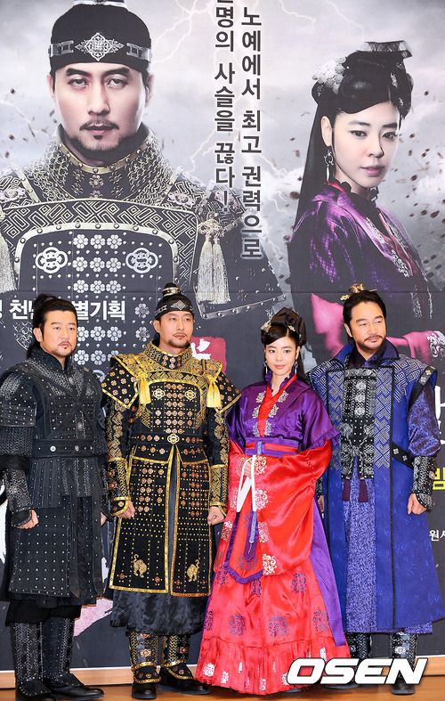 30일 오후 경남 합천 대장경 천년관에서 공개된 드라마 '무신' 제작발표회에서 출연배우들이 포즈를 취하고 있다.