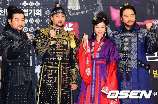 30일 오후 경남 합천 대장경 천년관에서 공개된 드라마 '무신' 제작발표회에서 출연배우들이 파이팅을 하고 있다.