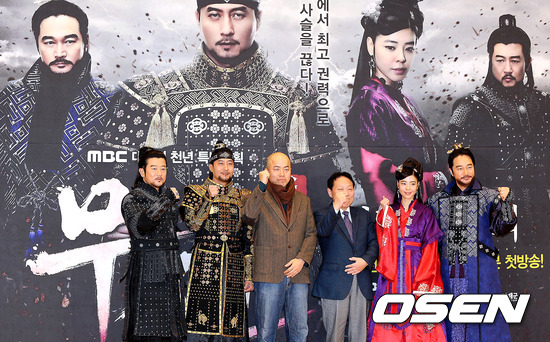 30일 오후 경남 합천 대장경 천년관에서 공개된 드라마 '무신' 제작발표회에서 출연배우들과 제작진이 포즈를 취하고 있다.