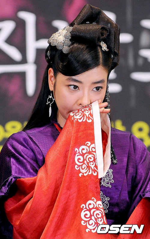30일 오후 경남 합천 대장경 천년관에서 공개된 드라마 '무신' 제작발표회에서 배우 김규리가 얼굴을 만지고 있다.