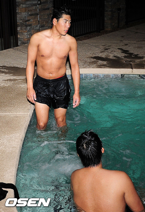 30일(한국시간) 미국 애리조나주 서프라이즈 '텍사스 레인저스 볼파크' 근처 넥센 히어로즈 숙소의 풀장에서 야간에 넥센 강정호가 스파를 하고 있다.