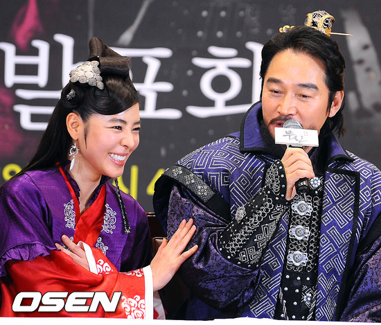 30일 오후 경남 합천 대장경 천년관에서 공개된 드라마 '무신' 제작발표회에서 배우 정보석이 김규리의 소감에 말을 하고 있다.