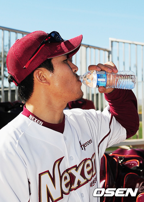 31일(한국시간) 미국 애리조나주 서프라이즈 '텍사스 레인저스 볼파크'에서 진행된 넥센 스프링캠프에서 훈련 김병현이 물을 마시고 있다.