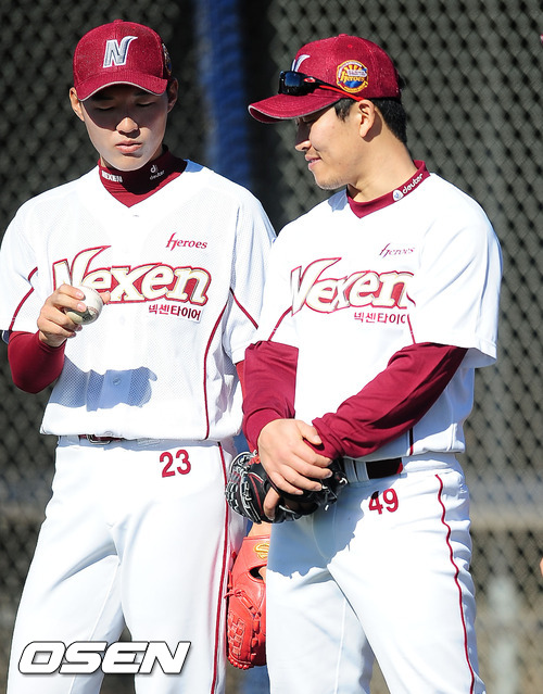 31일(한국시간) 미국 애리조나주 서프라이즈 '텍사스 레인저스 볼파크'에서 진행된 넥센 스프링캠프에서 이태양이 김병현에게 그립에 대해 물어보고 있다.