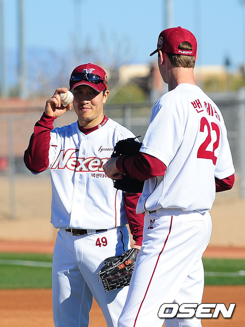 31일(한국시간) 미국 애리조나주 서프라이즈 '텍사스 레인저스 볼파크'에서 진행된 넥센 스프링캠프에서 김병현이 밴헤켄에게 그립법을 보여주고 있다.