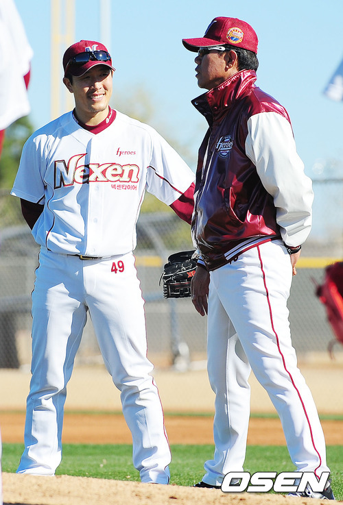 31일(한국시간) 미국 애리조나주 서프라이즈 '텍사스 레인저스 볼파크'에서 진행된 넥센 스프링캠프에서 김병현이 김시진 감독과 즐겁게 얘기를 나누고 있다.