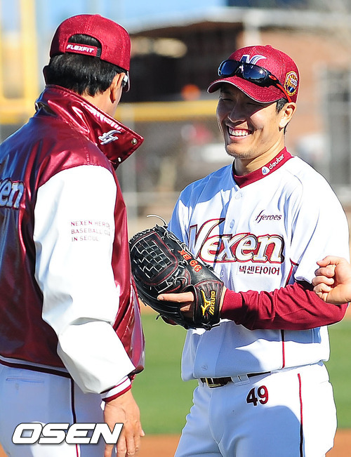 31일(한국시간) 미국 애리조나주 서프라이즈 '텍사스 레인저스 볼파크'에서 진행된 넥센 스프링캠프에서 김병현이 김시진 감독의 말에 환하게 웃고 있다.