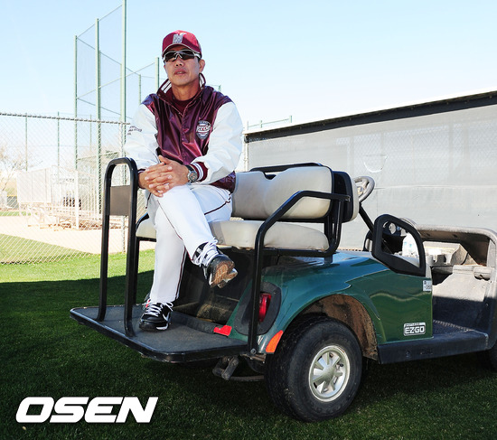 31일(한국시간) 미국 애리조나주 서프라이즈 '텍사스 레인저스 볼파크'에서 진행된 넥센 스프링캠프에서 김시진 감독이 카트를 세우고 선수들의 훈련 상황을 지켜보고 있다.