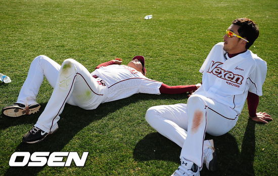 31일(한국시간) 미국 애리조나주 서프라이즈 '텍사스 레인저스 볼파크'에서 진행된 넥센 스프링캠프에서 강정호와 이택근이 훈련을 마치고 휴식을 취하고 있다.