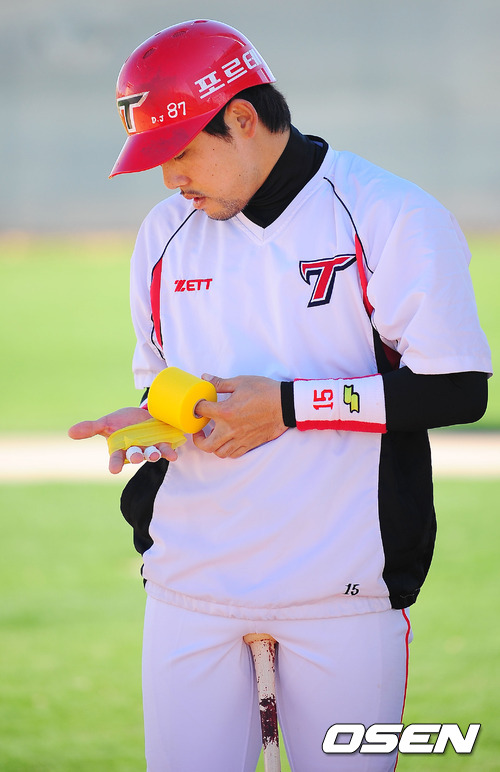 31일(한국시간) 미국 애리조나주 서프라이즈 '캔자스시티 로열스 컴플렉스'에서 진행된 KIA 스프링캠프에서 이용규가 테이핑을 하고 있다.