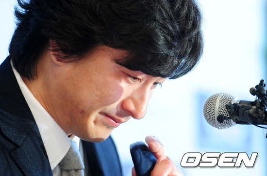 안정환이 기자회견을 도중 인사를 하며 눈물을 흘리고 있다.