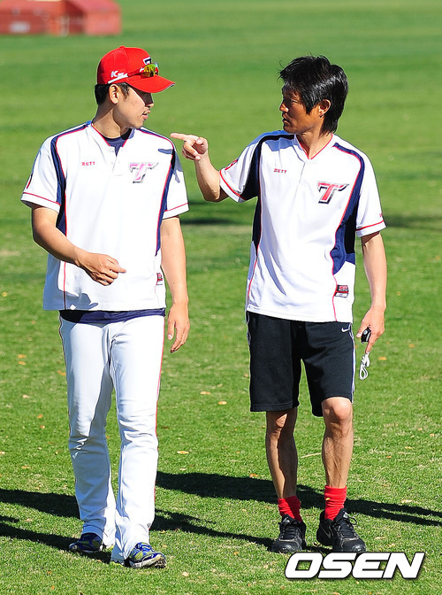 31일(한국시간) 미국 애리조나주 서프라이즈 '캔자스시티 로열스 컴플렉스'에서 진행된 KIA 스프링캠프에서 미나미타니 트레이닝 코치가 윤석민과 함께 공원을 걸으며 얘기를 나누고 있다.