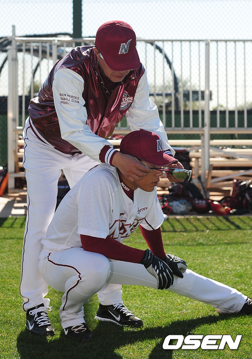 31일(한국시간) 미국 애리조나주 서프라이즈 '텍사스 레인저스 볼파크'에서 진행된 넥센 스프링캠프에서 강정호가 몸을 풀때 김시진 감독이 강정호의 선글라스를 벗기며 살피고 있다.