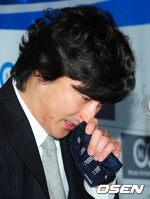 안정환이 은퇴 소감을 말하며 울먹이고 있다.