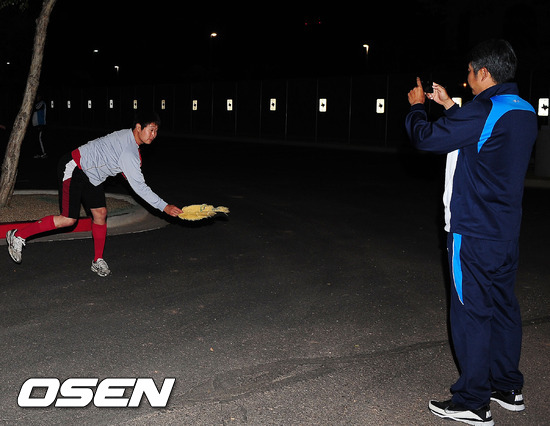 31일(한국시간) 미국 애리조나주 서프라이즈 '텍사스 레인저스 볼파크'에서 진행된 넥센 스프링캠프 중 야간의 볼파크 주차장에서 정민태 투수 코치가 이정훈의 쉐도우 피칭을 핸드폰으로 녹화하고 있다.
