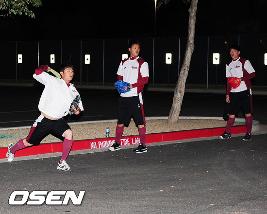 31일(한국시간) 미국 애리조나주 서프라이즈 '텍사스 레인저스 볼파크'에서 진행된 넥센 스프링캠프 중 야간의 볼파크 주차장에서 김상수 김정훈 장효훈이 쉐도우 피칭을 하고 있다.
