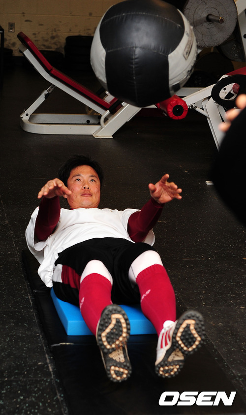 31일(한국시간) 미국 애리조나주 서프라이즈 '텍사스 레인저스 볼파크'에서 진행된 넥센 스프링캠프 중 웨이트 룸에서 주장 강병식이 구슬땀을 흘리고 있다.