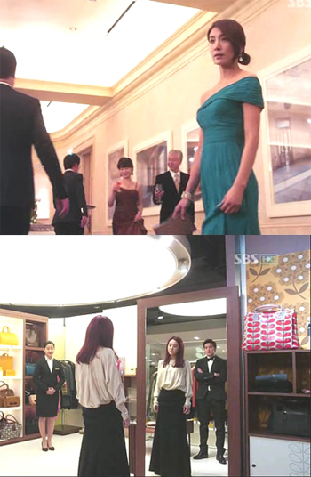 뿐만 아니라 연회장을 가기 전 드레스를 고르는 장면에서 정려원이 입어본 롱 드레스 역시 시청자들의 눈길을 끌었다. 이는 투피스처럼 보이는 투톤 스타일의 매력적인 드레스로 상의의 풍성한 핏과 하의의 슬림한 머메이드 라인이 조화를 이루어 마른 체형인 정려원에게 볼륨감을 불어넣었다.