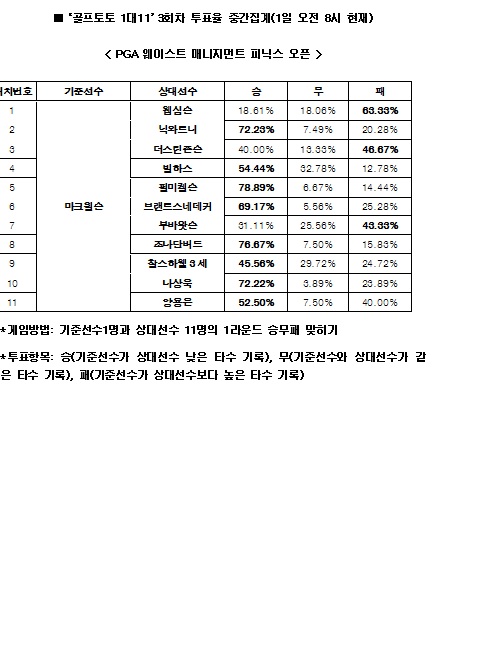 반면 웹심슨(63.33%)과 더스틴존슨(46.67%), 부바왓슨(43.33%)은 마크윌슨보다 적은 타수 기록 예상이 많은 타수 기록 예상을 앞서 우세가 전망됐다.