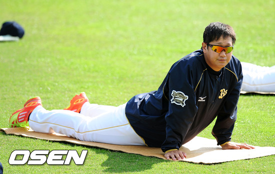 1일 일본 오키나와현 미야코지마 시민구장에서 열린 일본프로야구 버팔로 오릭스의 스프링캠프 첫 훈련에서 이대호가 몸풀기 운동을 하고 있다.
