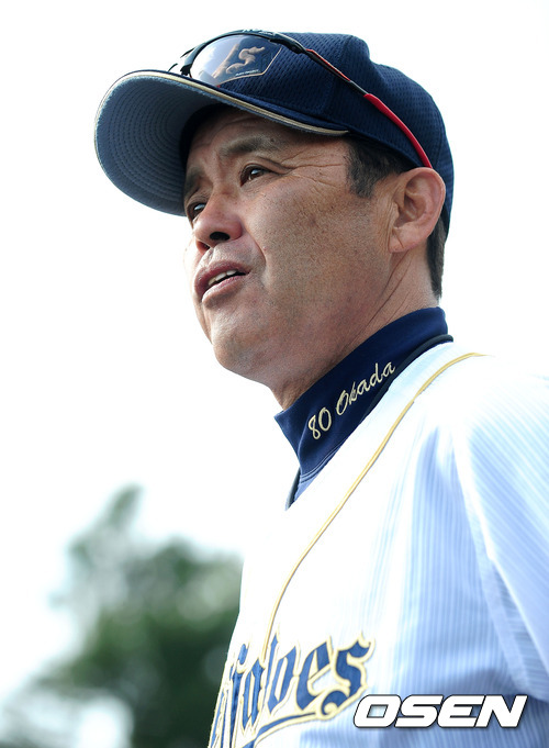 1일 일본 오키나와현 미야코지마 시민구장에서 열린 일본프로야구 버팔로 오릭스의 스프링캠프 첫 훈련에서 오카다 감독이 취재진과 인터뷰를 갖고 있다.