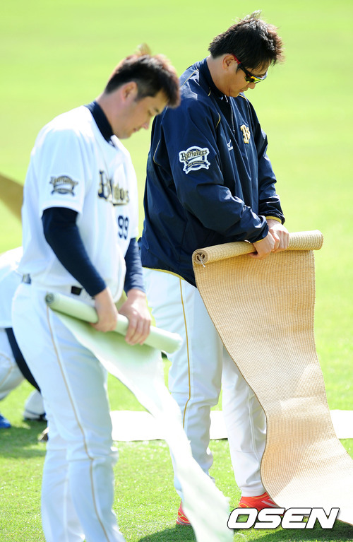 1일 일본 오키나와현 미야코지마 시민구장에서 열린 일본프로야구 버팔로 오릭스의 스프링캠프 첫 훈련에서 백차승과 이대호가 훈련용 돗자리를 정리하고 있다.