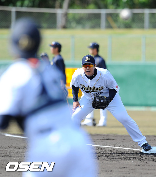 1일 일본 오키나와현 미야코지마 시민구장에서 열린 일본프로야구 버팔로 오릭스의 스프링캠프 첫 훈련에서 이대호가 수비 훈련을 하고 있다.