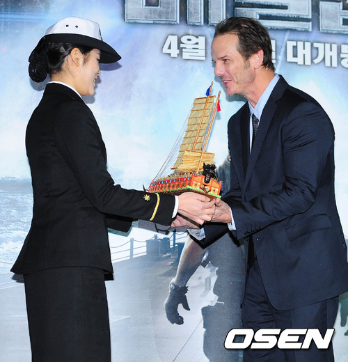 [OSEN = 백승철 기자] 영화 '배틀쉽'의 감독 피터 버그가 2일 오후 서울 소공동 명동 롯데시네마에서 열린 내한 로드쇼에서 거북선 모형을 한국해양대학교 학생으로 부터 선물 받고 있다.