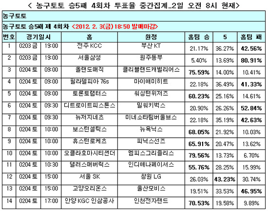 농구토토 승5패 4회차 게임은 오는 3일(금) 오후 6시 50분에 발매가 마감된다