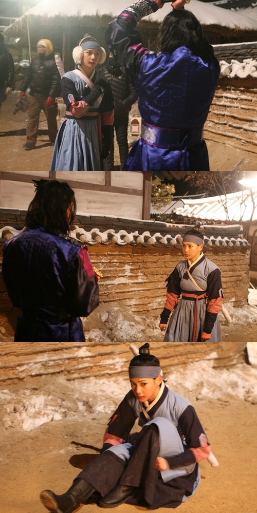MBC 수목미니시리즈 '해를 품은 달(이하 '해품달')'에서 월(한가인 분)을 지키는 호위무사 설 역을 맡은 윤승아가 과 훤(김수현 분)을 그림자처럼 수호하는 운 역할의 송재림과 긴장감 있는 검술 액션을 펼친 것.