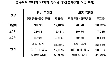 전반전에서는 국민은행 우세(50.90%)예상이 1순위로 집계됐고, 우리은행 우세(31.26%)예상과 5점 이내 박빙(17.83%)예상이 뒤를 이었다. 전반득점대에서는 30-35점대 국민은행 우세(12.81%)예상이 최다 집계됐고, 최종득점대에서는 70-70점대 접전(20.02%)예상이 가장 높게 나타났다.