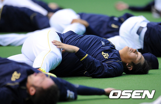 3일 일본 오키나와현 미야코지마 시민구장에서 열린 일본프로야구 버팔로 오릭스의 스프링캠프 훈련에서 이대호가 스트레칭 훈련을 하고 있다.