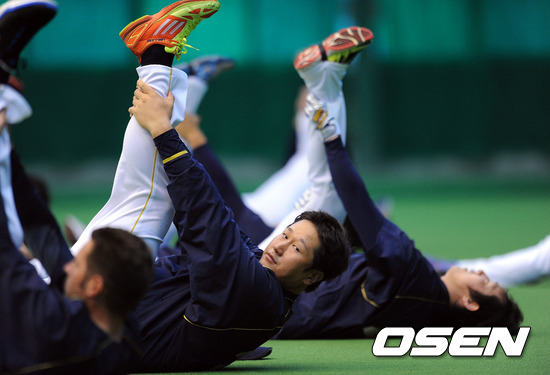 3일 일본 오키나와현 미야코지마 시민구장에서 열린 일본프로야구 버팔로 오릭스의 스프링캠프 훈련에서 이대호가 스트레칭 훈련을 하고 있다.