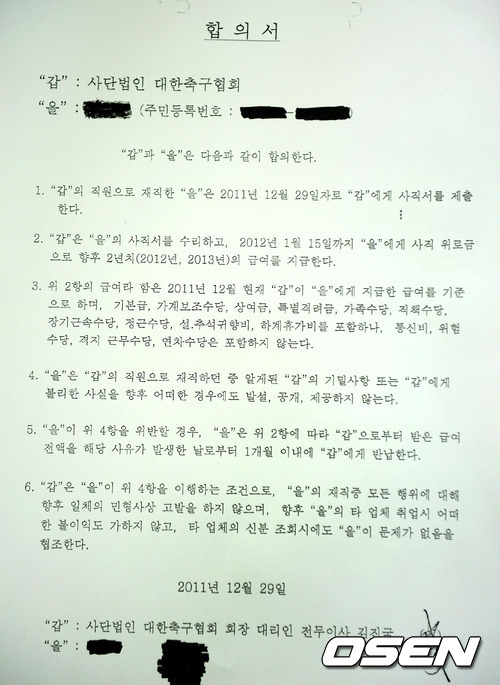 3일 오후 서울 신문로 축구회관에서 조중연 회장의 기자회견을 마치고 내부 비리를 일으킨 A직원과의 합의서를 공개했다.
