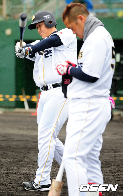 3일 일본 오키나와현 미야코지마 시민구장에서 열린 일본프로야구 버팔로 오릭스의 스프링캠프 훈련에서 이대호와 T-오카다가 타격 훈련을 준비하고 있다.