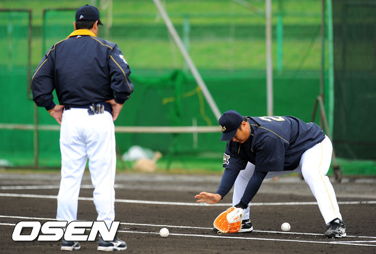 3일 일본 오키나와현 미야코지마 시민구장에서 열린 일본프로야구 버팔로 오릭스의 스프링캠프 훈련에서 이대호가 모리와키 히로시 코치가 바라보는 가운데 수비 훈련을 하고 있다.