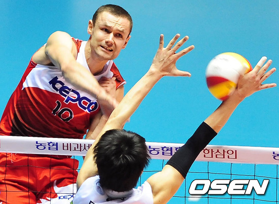 4일 오후 서울 장충체육관에서 열린 '2011-2012 NH농협 V리그' 남자부 드림식스와 KEPCO의 경기 1세트 KEPCO 안젤코의 스파이크가 드림식스 민경환의 블로킹에 막히고 있다.