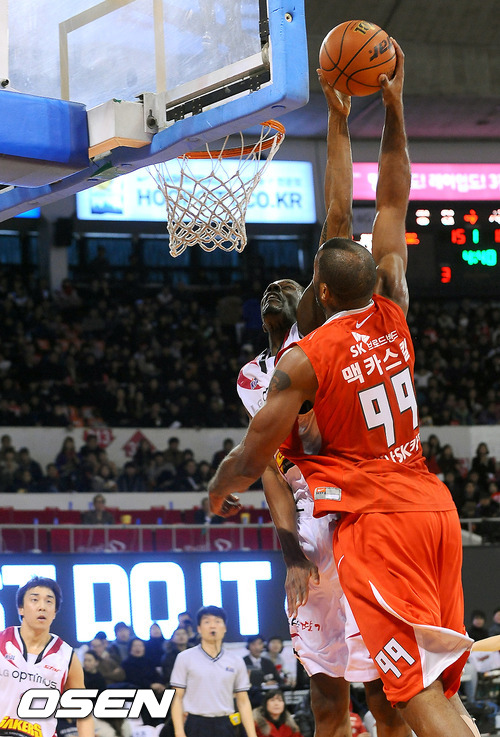 4일 오후 서울 잠실학생체육관서 열린 '2011-2012 KB국민카드 프로농구' 서울 SK와 창원 LG의 경기 1쿼터 LG 헤인즈가 SK 맥카스킬의 골밑슛을 슛블록 성공하고 있다.