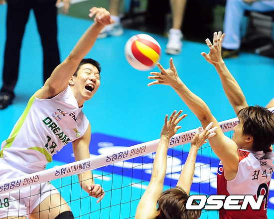 4일 오후 서울 장충체육관에서 열린 '2011-2012 NH농협 V리그' 남자부 드림식스와 KEPCO의 경기 2세트 드림식스 신영석이 공격을 시도하고 있다.